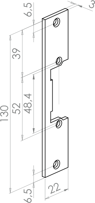 Kluczową cechą tego modelu jest jego szerokość wynosząca zaledwie 22 mm (standardowe blachy mają zazwyczaj 25 mm). Te 3 mm różnicy często decydują o możliwości estetycznego montażu elektrozaczepu w cienkich ościeżnicach bez konieczności ich nacinania czy deformowania. Długość 130 mm zapewnia stabilne mocowanie i odpowiednie maskowanie gniazda w futrynie.