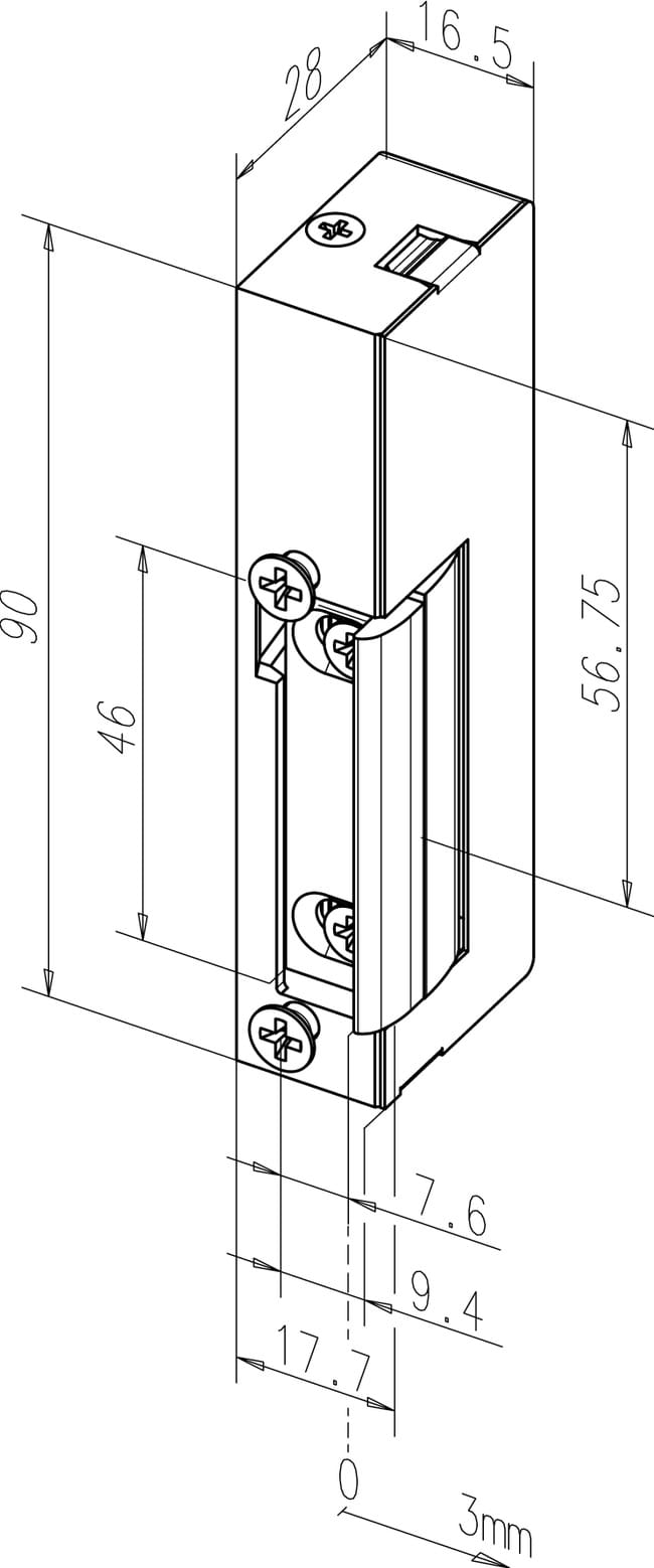 Wąski elektrozaczep symetryczny SCOT ES16-U24-B PROFI (16,5 mm) z funkcją blokady mechanicznej. Dedykowany do systemów zasilanych napięciem 24V AC/DC. Idealny do wąskich profili drzwiowych. Wytrzymałość 3000N, regulacja języka 0-3 mm.