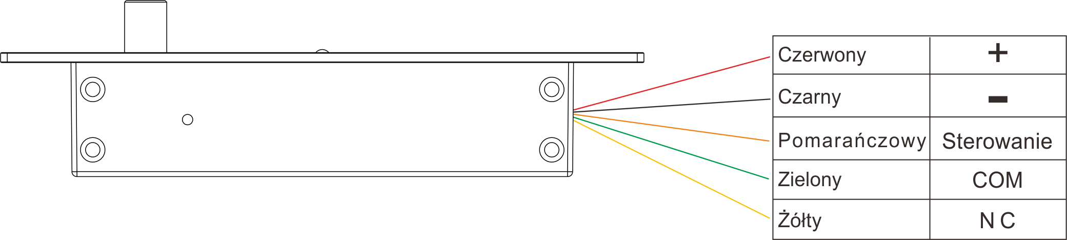 - Styk sygnalizacyjny NO: Pozwala na podłączenie zamka do systemu alarmowego lub kontroli dostępu, informując o fizycznym położeniu drzwi.