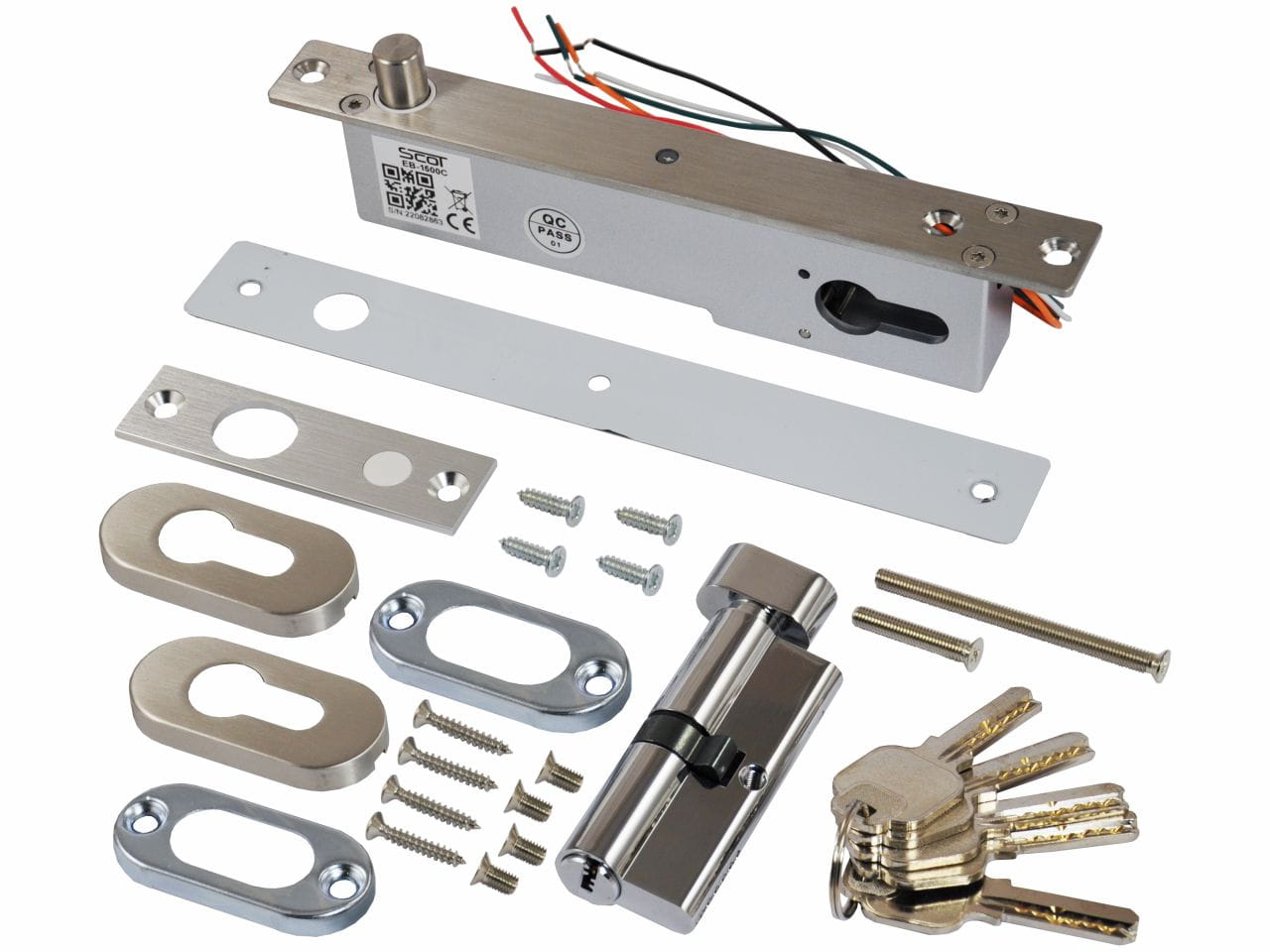 Model EB-1500C wyróżnia się na tle konkurencji wbudowaną wkładką bębenkową (w zestawie z 5 kluczami). Jest to elektrozamek typu NC (Normally Closed), co oznacza, że w przypadku braku zasilania drzwi pozostają zaryglowane. Dzięki obecności tradycyjnego zamka, użytkownik zawsze posiada możliwość awaryjnego otwarcia przejścia za pomocą klucza, co eliminuje ryzyko blokady w przypadku awarii prądu lub systemu sterującego. Solidny trzpień blokuje skrzydło drzwi w ościeżnicy, gwarantując odporność na próby siłowego sforsowania.
