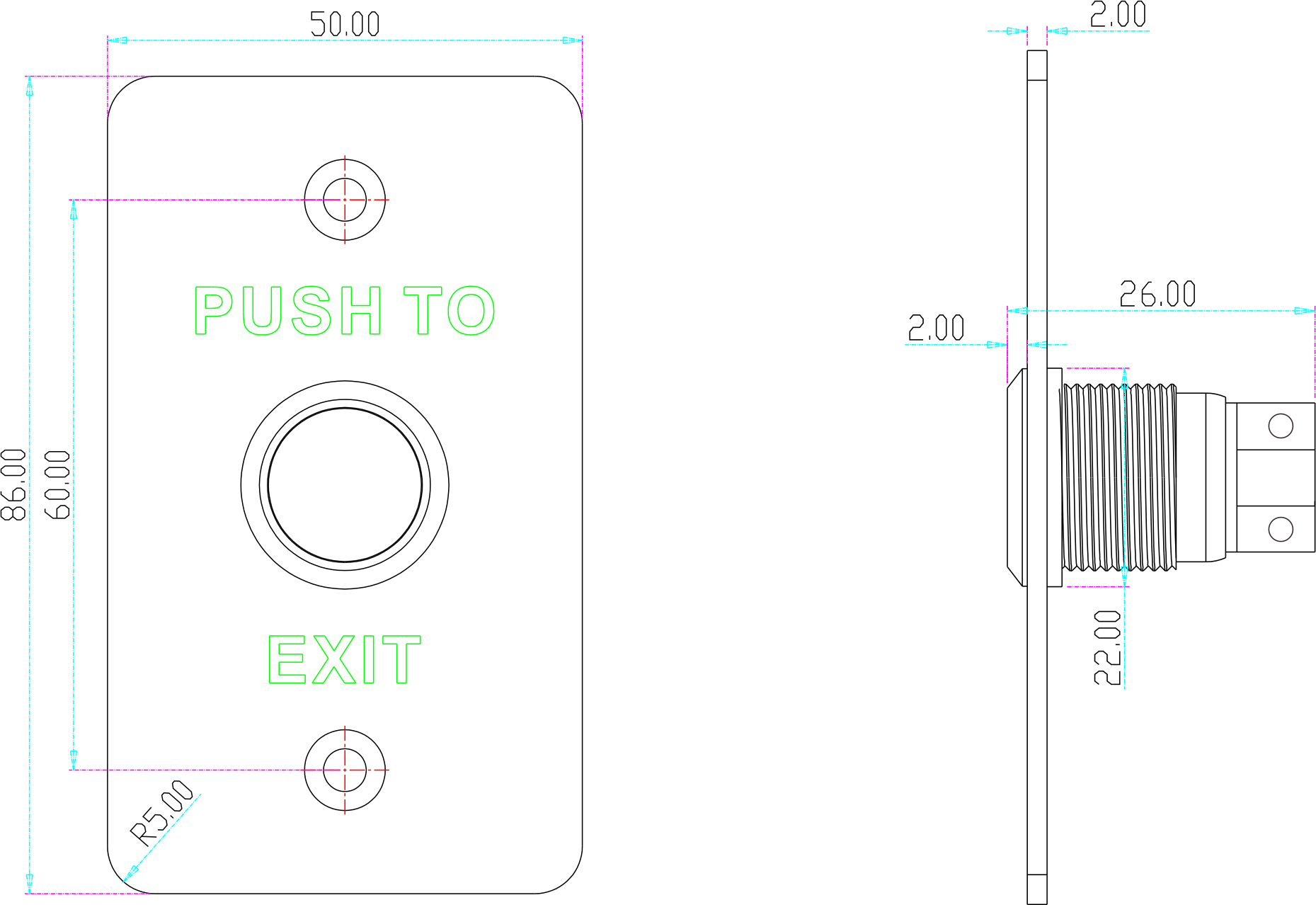 Zarówno panel frontowy, jak i przycisk wykonane są z trwałej stali nierdzewnej. Materiał ten zapewnia wysoką odporność na uszkodzenia mechaniczne, korozję oraz zużycie wynikające z częstego użytkowania. Na płycie czołowej znajduje się wytłoczony, czytelny napis "PUSH TO EXIT", który jednoznacznie informuje o funkcji urządzenia, zapewniając intuicyjną obsługę systemu.