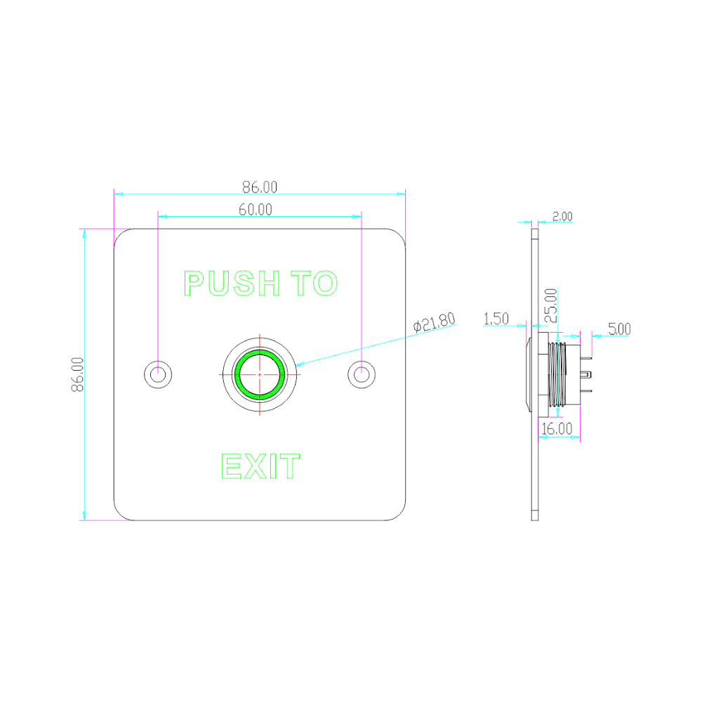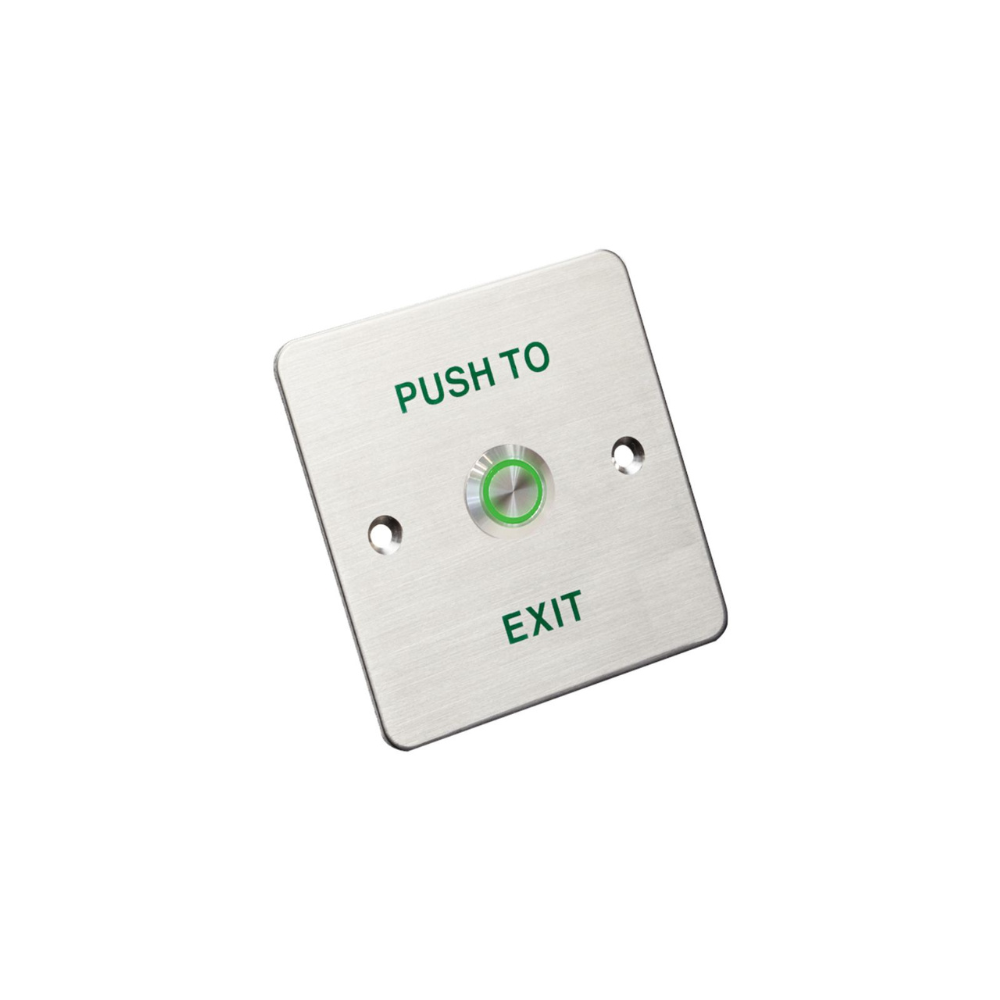 Przycisk posiada klasyczny, kwadratowy panel o wymiarach 86 x 86 mm, wykonany ze szczotkowanej stali nierdzewnej. Taki design nie tylko zapewnia nowoczesny wygląd, ale także wysoką odporność na uszkodzenia mechaniczne i korozję. Wokół przycisku znajduje się estetyczne, pierścieniowe podświetlenie LED w kolorze zielonym, które ułatwia lokalizację wyjścia po zmroku.