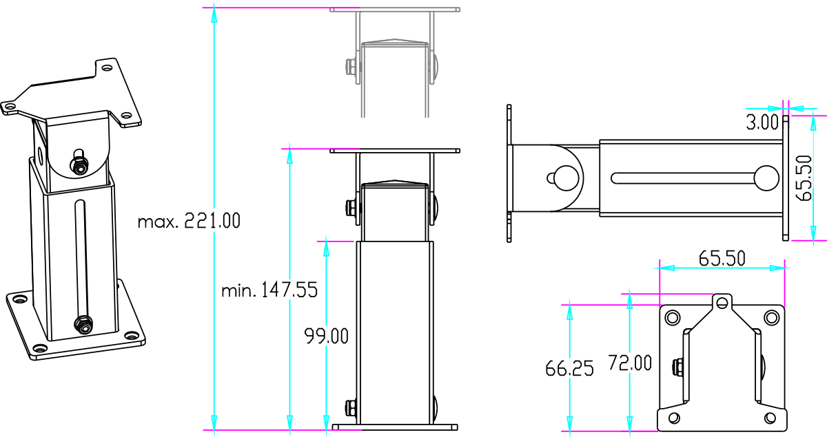 Regulowany wspornik montażowy SCOT BK-DH2 dedykowany do trzymaczy drzwiowych serii DH-20 oraz DH-30. Umożliwia montaż w pionie (podłoga) lub poziomie (ściana) z pełną regulacją długości (147-221 mm) oraz kąta nachylenia elektromagnesu. Niezbędny przy nietypowej zabudowie stolarki drzwiowej.